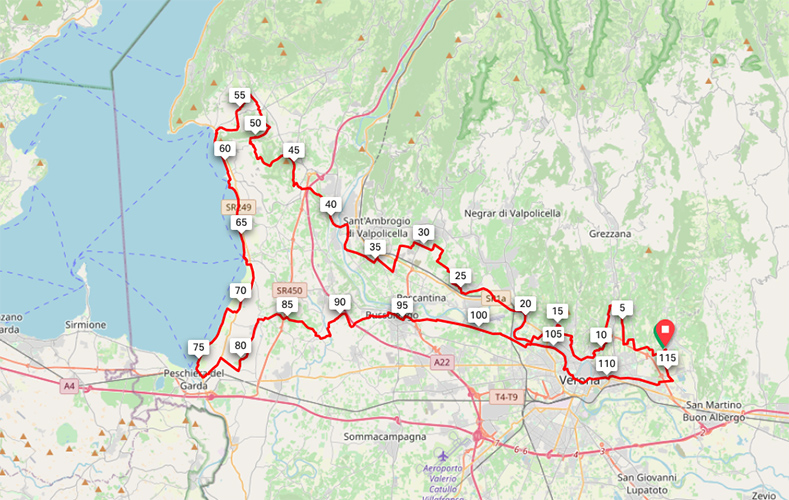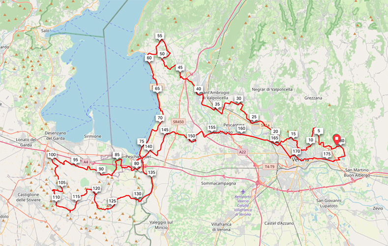La partenza è da Montorio e poi, per nascoste stradine alla base della Valpolicella, si arriva al Lago di Garda. Prima si ammira dall’alto e poi si costeggia passando da Garda e Peschiera. Si torna dall’entroterra intercettando la pista ciclabile a Bussolengo, nel finale si attraversa il cuore di Verona.