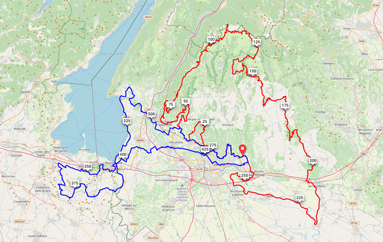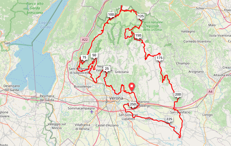 Prevede di percorrere tutti i tre itinerari. Si inizia con il percorso da 260 km e, tornati al punto di partenza, si prosegue con il 200 km che però dà la possibilità data la sua configurazione, di essere ridotto di 70 km, evitando il circuito delle Colline Moreniche. Se si è in gran forma si può invece fare anche quello. L’itinerario completo attraversa i paesaggi della Lessinia e anche quelli del Lago di Garda.